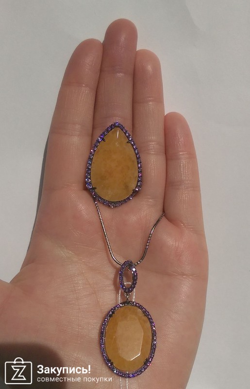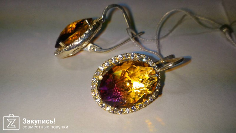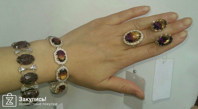 Аметрин это удивительный желто- сиреневый камень. Сочетает в себе свойства сразу двух минералов цитрина и аметиста. Очень блестящий и безумно красивый камень. Выглядит очень \"дорого-богато\" ))))но в хорошем смысле этого слова! Цирконы в браслете и кольце прекрасно подчеркивают красоту камня! Очень рада своему приобретению , я его уже успела выгулять на мероприятии,и без лишней скромности хочу сказать что притягивает внимание этот мистический и загадочный камень к себе! Притягивает!