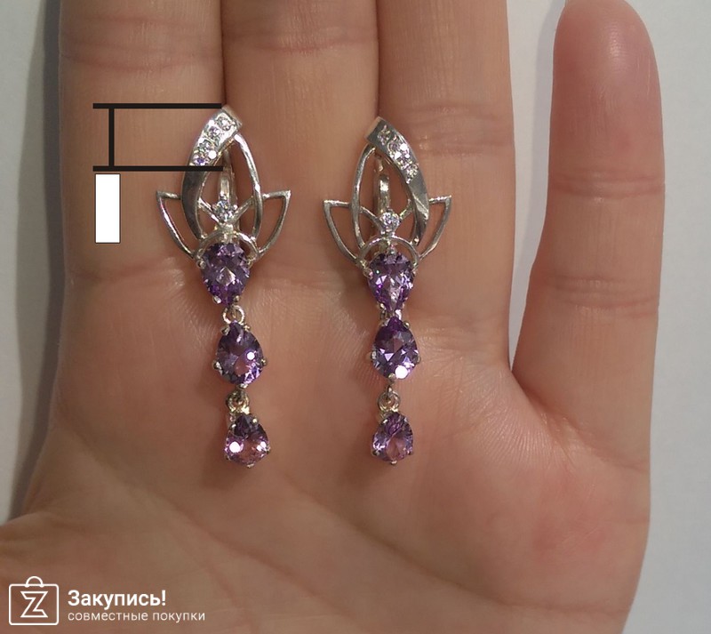 Первые сережки с искусственным лондонским топазом, но цвет камня очень естественно-природный! И сережки с аметистом, моделька очень интересная, у нее верхняя часть перекрывает частично мочку уха, я даже сделала отметку на фото где начинается штифт.