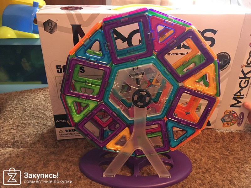 Конструктор оставил только приятное впечатление, с оригиналом не знакома, поэтому сравнить не с чем. Магниты не особо мощные, но до 10 деталей держатся. Собрали колесо-обозрения, но при соединении шестиугольника магнитного с прозрачный оба треснули, на фото видно. И много ненужных, на мой взгляд, деталей (прозрачные вставки с картинками).