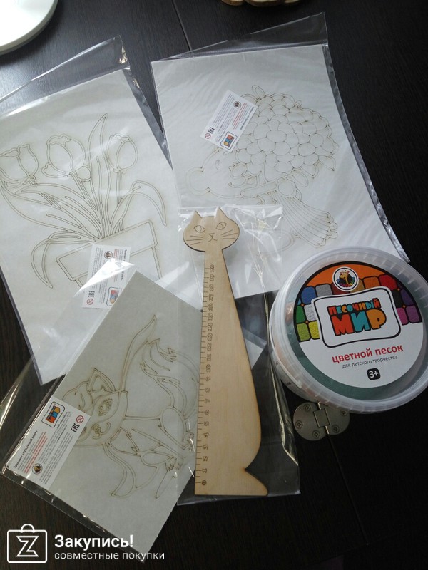 Заказывала песочные наборы для малышей и набор елочные игрушки. Наборы хорошие, песочка много. В наборе для малышей две основы размером, примерно, 9*9 см, что позволяет сделать малышу картинку за один раз и сразу увидеть свой результат, а не растягивать на долгое время.