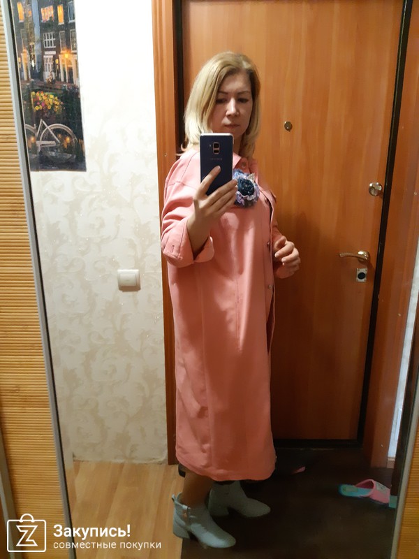 Ткань такая как у плащей,гладкая,плотная, оч хорошая. капельки дождя не впитываются,стекают. Мне с моим ростом,конечно и рукав длинный,я его внутрь загнула. На 40-42 плечи смотрятся как на модели с фото. Еще у него,конечно,как и у пальто оч красивый подклад.
