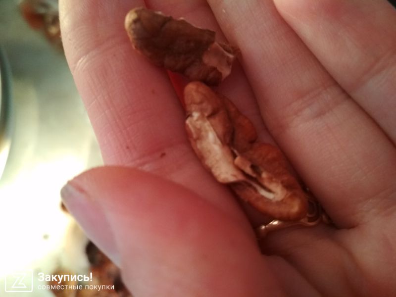 А вот пекан огорчил, все орехи в расколотой скорлупе. Когда достаешь орех, он на вид вроде ничего, а внутри, если его разломить, сердцевина коричневая и вкус сладковато-противный. Явно испорчены, только на выброс. Жаль денег.