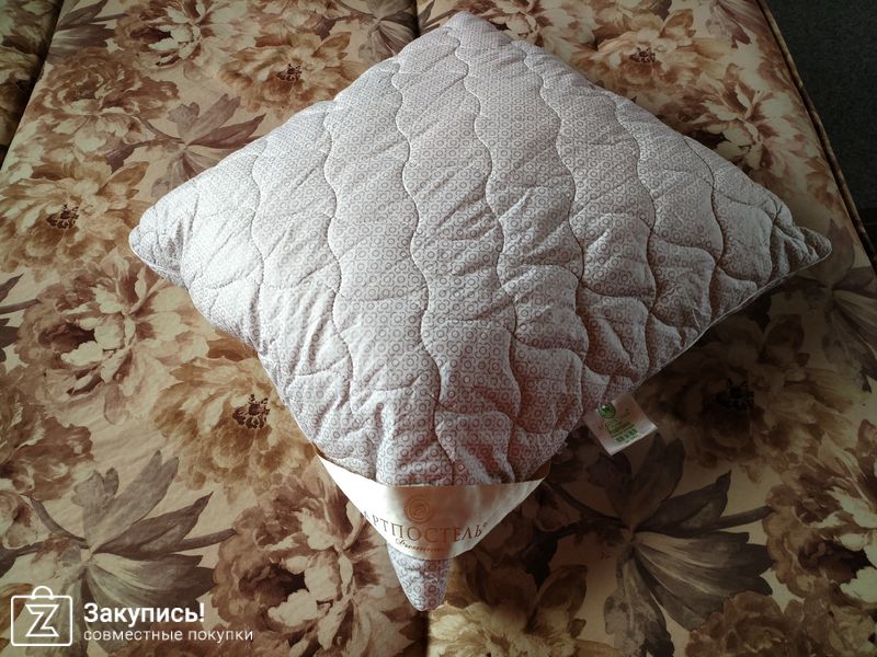 Подушка пришла в фирменном чехле очень красивая, без лишних ниток, чехол на молнии. Взбила ее и она стала огромная, мягкая. Поспав одну ночь решили немного убавить наполнитель. Теперь у нас в семье борьба за нее.
