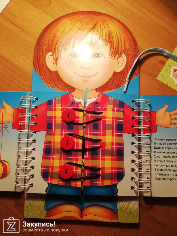 Добрый день. Рекомендую вам обратить внимание на книжку-тренажёр Одеваюсь сам. Мой вариант, как вы заметили, для мальчиков. Есть ещё вариант для девочек. Книга предлагает ребёнку научиться застегивать молнии, пуговицы, липучки, пряжки, а также завязывать шнурки и ленточки. Качество хорошее.