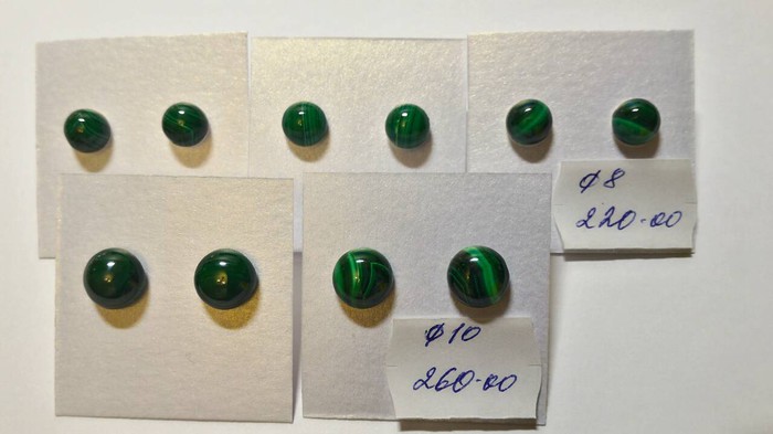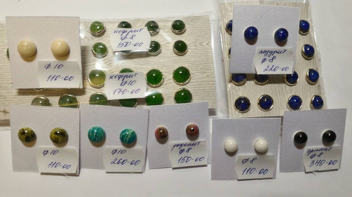 Пуссеты диаметром 15 мм, кольцо 18 мм, но вряд ли у них есть сырье белый нефрит, это редкий камень. Спрошу завтра. И по ценам узнаю, хотя бы примерно, если сырье есть. Про малахит сегодня сказали, что нет пока камней, но возможно подвезут им еще, если успеют, то изготовят!