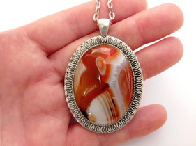 Кулон с натуральным сардониксом, в ассортименте (разное обрамление камня), размер 40*30 мм, ювелирный сплав, на цепочке