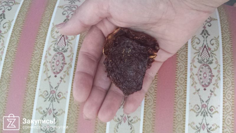 Заказала по памяти вяленые томаты,тк в первом заказе они были вкусными и как на фото. То,что я получила теперь-жуть просто. Почти черное,черно-темно-коричневого цвета.Пересушенное до невозможности.О соблюдении технологии вяления даже речи не идет (я дома сама вялю,просто свое закончилось) .Нельзя это в пищу употреблять, естественно. ,деньги на выброс.Больше не закажу .