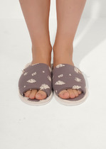Домашние тапочки с открытым носом из хлопкового трикотажного полотна, сверху нашивка. Толстая подошва.