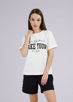 Джемпер из хлопкового трикотажного полотна. Короткий втачной рукав. Круглый вырез горловины. По переду принт.— Описание у На сайте поставщика