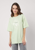 Джемпер из хлопкового трикотажного полотна. Короткий втачной рукав. Круглый вырез горловины. По переду термоапликация.— Описание у На сайте поставщика
