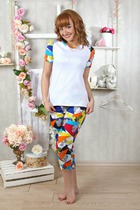 Костюм: майка с принтом, шорты цветные, на резинке.Состав: Кулирка (100% хлопок)..Размеры: 42-56.