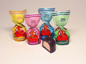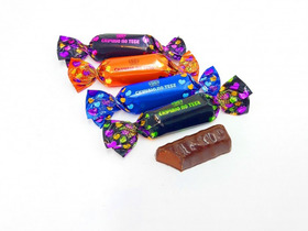 Конфеты куполообразной формы, с комбинированной начинкой, со вкусами черной смородины, клюквы, яблока, клубники, апельсина.