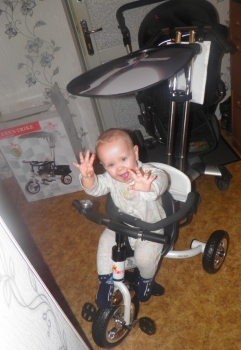 Доча тоже. В свои 1 год и 2 недели уже во всю звонит в звонок, радуется, на фото видно, что ноги до подставки достают. Наш рост 78 см!
