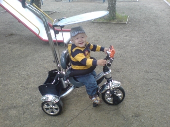 Вот наконец-то нашла время выложить фотку!!!! Велик просто замечательный,еще ни у кого тоакого не видели.На нем научились кататься на двухколесах,до этого катались на 4х колесном(нам сейчас 3,8г)А переключатель скоростей вообще писк моды-планетарный,такие сейчас ставят только на дорогоие взрослые велики.