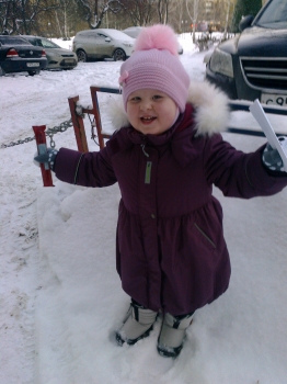 ну вот руки дошли... зима закончилась! в костюме отходили - ляпота. Ходили без поддевы (один раз только одели штанишки флис), а так только колготки и легкую кофту на футболку - ни разу не замерзли. Капюшон большой пригодился - на шапку с помпоном одевали от ветра. Куртку думаю еще проносим (правда не знаю сколько), а вот штанишки уже коротковаты, но мы вытянулись очень: к концу зиму нам было 1 г 5 м и рост у нас 85 см. Доча бегала в нем свободно (только начинали ходить).