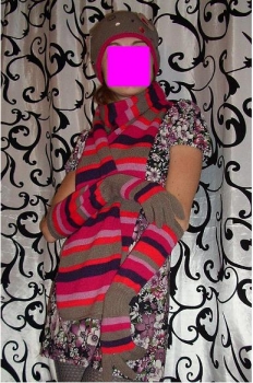 Я тоже хочу похвастаться шапочкой, вернее набором NAOMI. Шапочка двойная. теплая. Шарфик оказался длинным, чему я очень рада.Стразы на шапочке и на шарфике так блестят, супер, на фото плохо видно. Вообщем наборчик очень классный! Ксюша большое спасибо!!!