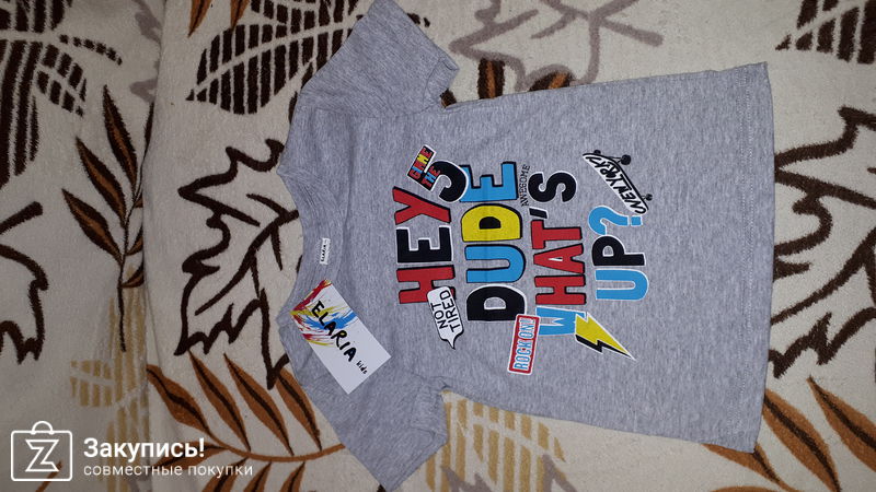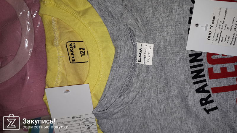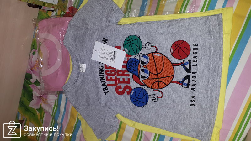 Футболки серые ОЧЕНЬ маломерят, рост 122 подходит на 110, а не 116, как предполагалось. Разница на фото. Желтая тоже 122, фирма одна и та же, у нее размер соответствует. Пижама рост 122-128 подходит примерно лет на 7, качество хорошее, шортики простые черные за 76 рублей, просто сказка. Спасибо организатору.