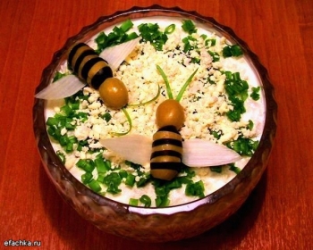 Режем маслины на 4 части и сверху укладываем на салат. салат убрать в холодильник на 12 часов, перед подачей на стол по краям салата разложить чипсы в форме подсолнуха и в серединку посыпать тертый желток.