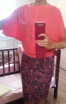 Еще заказывала костюм Carica KM-2003. Прошито всё замечательно. Материал тоненьких. Блузка типа шелка, рукав летучая мышь, совсем каплю при солнышке просвечивает. Юбочка тянется хорошо, без подклада. Размер 46 подошел идеально)