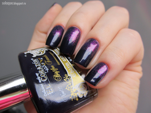 Основным лаком послужил темно-фиолетовый лак из коллекции Charm and Beauty. По своим свойствам он такой же как и другие представители этой коллекции, о которых я уже писала. Плотный насыщенный крем или как сказала Лена - эмалевый. Единственное с этим цветом мне понадобилось два слоя, чтобы закрасить небольшие просветы, которые остались после первого слоя. Еще как мне показалось лак не совсем чистый крем, в нем присутствуют мельчайшие частицы, что-то типа незаметного микрошиммера. Он виден когда лак еще не высох. Финиш меня просто поразил. Возможно из-за глубокого темного цвета или просто из-за особенности конкретно этого лака поверхность имела просто восхитительный глянец. Лак без всякого топа блестел как водная гладь. Безупречно ровный и сияющий.
