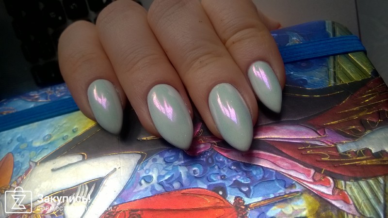 Помол довольно крупный, идеального эффекта зеркального хрома не будет, при ближайшем рассмотрении видны частички пигмента. Но эффект все равно потрясающий! Такой перламутровый, напоминает жемчуг, сиреневые блики смотрятся очень нежно. У меня на ногтях эта втирка на белой подложке. Топ не съел блеск, в отличие от втирки Masura. Ее, правда, многие ругают, топ тут не при чем.