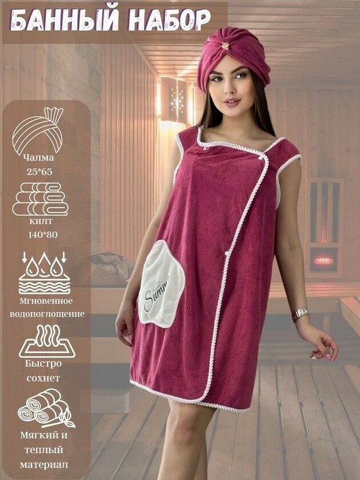 Комплект женский для бани и сауны "Красотка"-БРУСНИКА микрофибра 2 пр. (парэо + чалма)