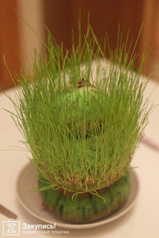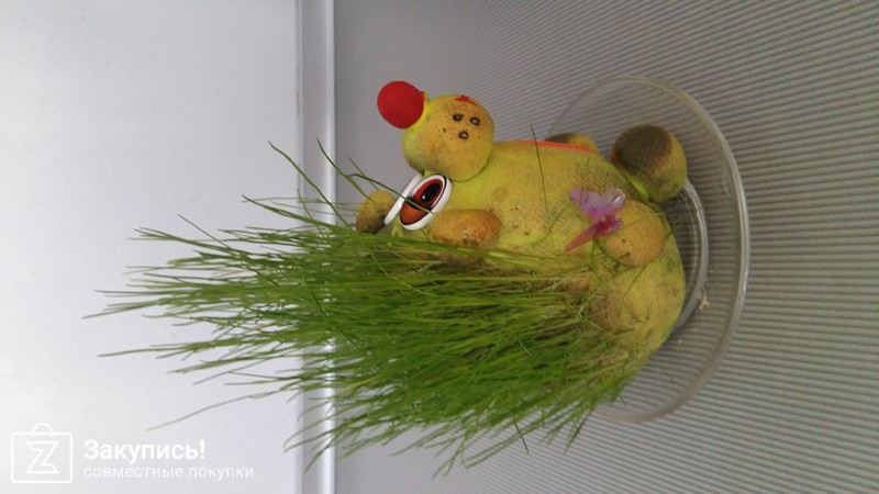 Оригинальный подарок, брала белого мишку, когда намок на белого мишку мало чем стал походить, просто смешной зверек. Травка быстро появилась, но после стрижки как-то хуже (у нас лично) растет. И на спинке семена не равномерно распределены.