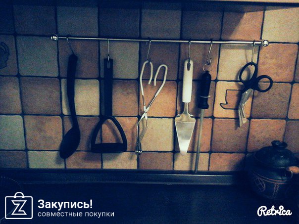 Заказывала уже много чего. На фото рейлинг с 6-ю крючками, лопатка, мусат (заточка д/ножей) щипцы для доставания продуктов из банки и др. Спасибо за эту закупку организаторам.