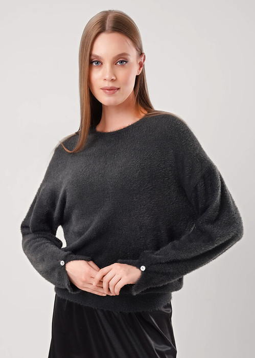 Вязаный джемпер умеренного объема, из фасонной пряжи ""травка"", переплетение гладь. Спущенная линия плеча, длинный рукав. Округлая горловина с бейкой. По низу изделия и рукавов узкие манжеты. По низу рукава разрез с пуговицей.