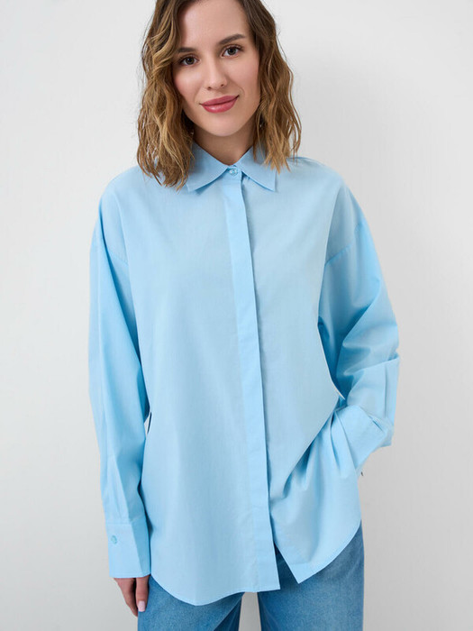 Женская голубая рубашка. Модель свободного кроя выполнена из лёгкого материала. Удобная застёжка на пуговицы. Классический отложной воротник, длинные рукава с манжетами на пуговицах. Нижний край рубашки красиво округлён.