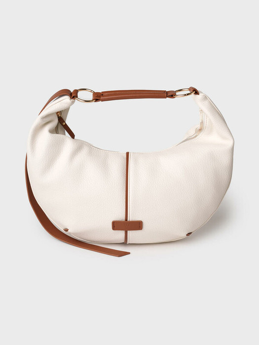 Женская сумка трендовой формы "луна". Сумка выполнена из мягкой искусственной кожи молочного цвета с отделкой  ремнями карамельного цвета. Сумку можно носить на плече. Сумка имеет одно отделение на молнии. Внутри есть три кармана: два открытых и один на молнии. Параметры сумки: высота - 30 см, ширина - 44 см, глубина - 6 см. В подарок идет брендированный пыльник.