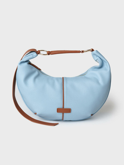 Женская сумка трендовой формы "луна". Сумка выполнена из мягкой искусственной кожи голубого цвета с отделкой ремнями карамельного цвета. Сумку можно носить на плече. Сумка имеет одно отделение на молнии. Внутри есть три кармана: два открытых и один на молнии. Параметры сумки: высота - 30 см, ширина - 44 см, глубина - 6 см. В подарок идет брендированный пыльник.