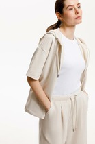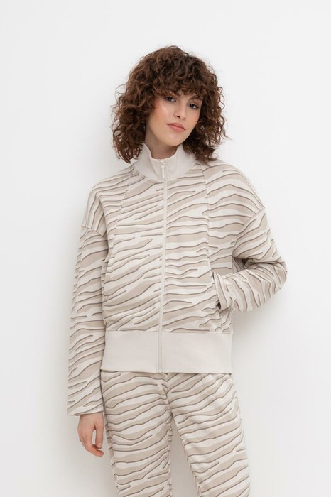 Тёплая трикотажная куртка на молнии с высоким воротником стойкой и широким поясом. Произведена из мягкого набивного трикотажного футера трёхнитки. В составе 80% натурального хлопка и 20% полиэстера, при этом полиэстер ввязан внутрь по особой технологии и не соприкасается с кожей.