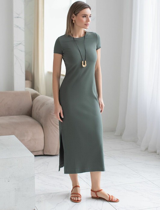 Платье выполнено из трикотажа в широкий рубчик. Модель дополнена высокими разрезами по бокам. Премиальное качество хлопковых волокон и наличие эластана в составе изделия способствуют идеальной посадке по фигуре не сковывая движений. Изделие сохранит свой безупречный внешний вид в течении долгого времени.