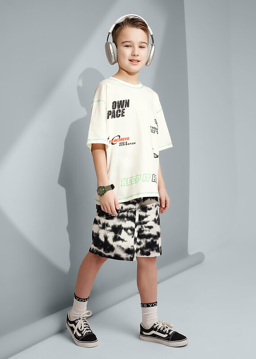 Стильные набивные шорты для мальчика из мягкого трикотажного полотна. Пояс на резинке с регулировкой обеспечивает комфортную посадку. Декоративные резы по переду с необработанными краями создают модный акцент.
