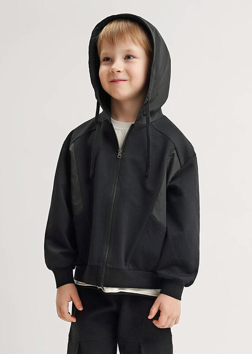 Удобная черная толстовка для мальчика с молнией, капюшон и боковые части из ветрозащитной плащевой ткани. Капюшон регулируется шнурком, есть вместительные карманы. Эластичные манжеты обеспечивают комфортную посадку по фигуре.