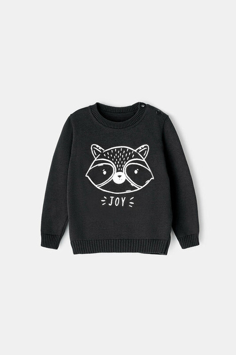 Вязаный джемпер с втачными рукавами. Украшен изображением енота. Связан из хлопковой пряжи. На рукавах эластичные манжеты. Внизу мягкий пояс. Застёгивается на пуговицу.