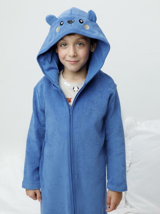 Халат на молнии с капюшоном. Изготовлен из мягкого махрового полотна, произведённого из натурального хлопка. В капюшоне подклад из высококачественного гладкого трикотажа супрем. Изделие украшено вышивкой и декоративными ушками. Края обработаны эластичным кантом. Все трикотажные полотна производятся в соответствии с нормами швейцарского сертификата ЭкоТекс.