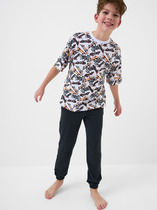 Пижама для мальчика из натурального хлопка. Джемпер с длинными втачными рукавами и брюки с эластичной резинкой в поясе. Мягкие манжеты по низу брюк сделаны из материала в рубчик. Оригинальная набивка и принт выполнены из стойких текстильных гипоаллергенных красителей. Изделие сохраняет цвет и форму после многократных стирок. Все трикотажные полотна производятся в соответствии с нормами швейцарского сертификата ЭкоТекс.