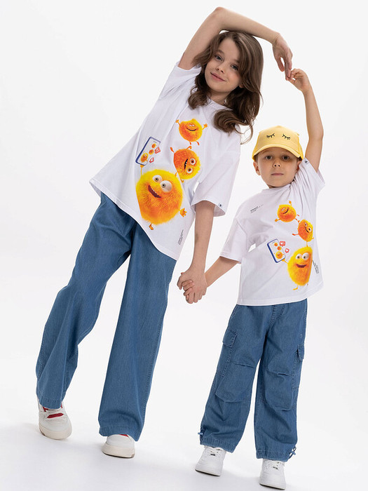 Детская футболка унисекс среднего объема. Прикольная нарядная футболка свободного силуэта со спущенным плечом не будет стеснять движений ребёнка. Вырез горловины отделан эластичной рибаной - голова не застрянет. Главная фишка футболки — яркий милый принт, изображающий персонажа, сгенерированного нейросетью (искусственным интеллектом). Это супермодный тренд! Принт эластичный и стойкий — без проблем переносит многочисленные стирки, не теряя своей яркости. На принте изображён забавный пушистый чудик (монстрик) желтого цвета + надписи "хихиканье", "искры радости для меня" и "создано с помощью искусственного интеллекта". Широкая размерная сетка позволяет приобрести такую футболку как малышу в детский садик так и подростку. . Белые футболки подходят для носки летом, осенью и весной (демисезон), а также зимой . Цвет товара на экране вашего устройства может отличаться от цвета изделия вживую.