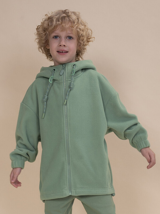 Толстовка для мальчика с капюшоном на застежке молнии. Капюшон с регулировкой на шнурках в крапинку со стопперами. Рукава собраны на широкую внутреннюю резинку. Объм понизурегулируется шнуром со стопперами. Два боковых внутренних кармана.