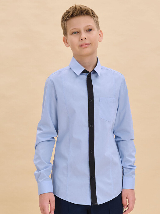 Школьная рубашка для мальчика из практичной ткани с современными деталями. Самые уязвимые для грязи детали выполнены из ткани контрастного цвета. Это разбавляет официальный стиль и позволяет не стирать белую рубашку каждый день.
