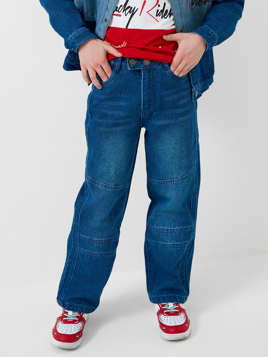 Джинсы для мальчика подростка. Прямой крой. Средняя посадка. Декоративные вставки и строчки. Застёжка на молнию и болт. Боковые и задние карманы. Этикетка “LUCKY RIDER” на поясе.
