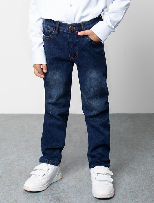 Синие джинсы выполнены из эластичного денима. Внутренняя сторона джинс из мягкого флиса, обеспечит тепло и комфорт на целый день. Есть дополнительная фиксация талии при помощи внутренней резинки. Изделие дополнено высококачественной металлической фурнитурой с логотипом бренда.