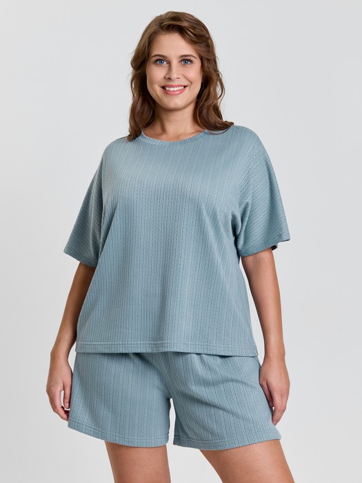 Костюм молодежный из гладкокрашеного фактурного трикотажного полотна, состоящий из футболки и шорт. Футболка – свободного кроя, с цельнокроеными рукавами, горловиной овальной формы, обработанной втачной планкой.Шорты – средней длины, свободные, с эластичной тесьмой по талии и шнурком, продетым в две обметанные петли.