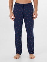 Костюм мужской, состоящий из футболки и брюк. Футболка однотонная с принтом на груди; модель свободная, со спущенной линией плеч, овальным вырезом горловины. Брюки из полотна с набивным рисунком эксклюзивного дизайна, прямые, с боковыми карманами с обтачными входами, на притачном поясе с отстроченной эластичной тесьмой.