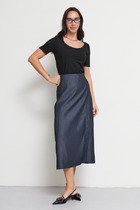 Платье женское из однотонного трикотажного полотна полуприлегающего силуэта, без рукавов, со спущенной линией плеча. Горловина круглая с разрезом по переду. Проймы и горловина спинки окантованы. Низ прямой.