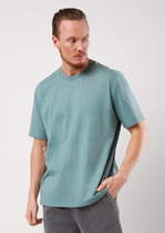 Футболка свободная укороченная, оверсайз. Горловина округлой формы обработана обтачкой из рибаны. Рукава втачные, корткие. Линия плеча спущена. На детали переда накладной карман (мод 111899-1). Нижние срезы футболки и рукавов обработаны швом вподгибку.