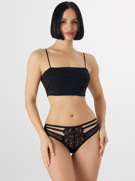 Трусы женские модель слипы, со средней посадкой, выполнены из эластичного кружева с отделкой сеткой.  Подкладка ластовицы выполнена из кулирного полотна, обтачная по переднему краю. Передняя деталь цельная, со средним швом, выполнена из эластичного кружева, с отрезными бочками из сетки и протяжками из эластичной тесьмы (декоративная DT10-10, артекс E7617/P). Нижние срезы и верхний срез детали из сетки обработан эл тесьмой 15 мм всгиб (ловабль F2-16, артекс EDOKU-16). Задняя деталь из эластичного кружева, со средним швом. Верхний срез задних деталей обработан эл тесьмой 15 мм всгиб (ловабль F2-16, артекс EDOKU-16).