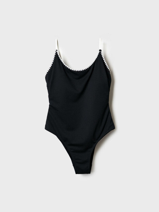 Женский слитный черный купальник. Модель с открытой спиной, оформленной декоративной завязкой. Тонкие бретели регулируются по длине. Передняя часть купальника украшена контрастной тесьмой, придавая модели выразительность. Внутри вшиты — мягкие чашки для поддержки и комфортная подкладка. Благодаря UF-защите, ткань сохраняет первоначальный вид даже при длительном пребывании на солнце. Подойдет для пляжа, отдыха и активного лета.